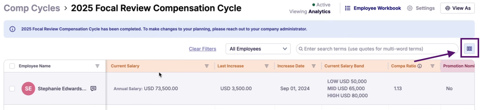 The Column Visibility feature allows users to customize which columns are visible to each planner within a compensation cycle. This helps ensure that every planner only sees the data they need.