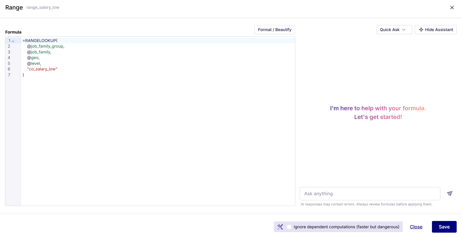 Once you click into the formula box, you will see both the formula and our AI-powered copilot formula assistant. Please note that the assistant is AI-powered and not a real person.
