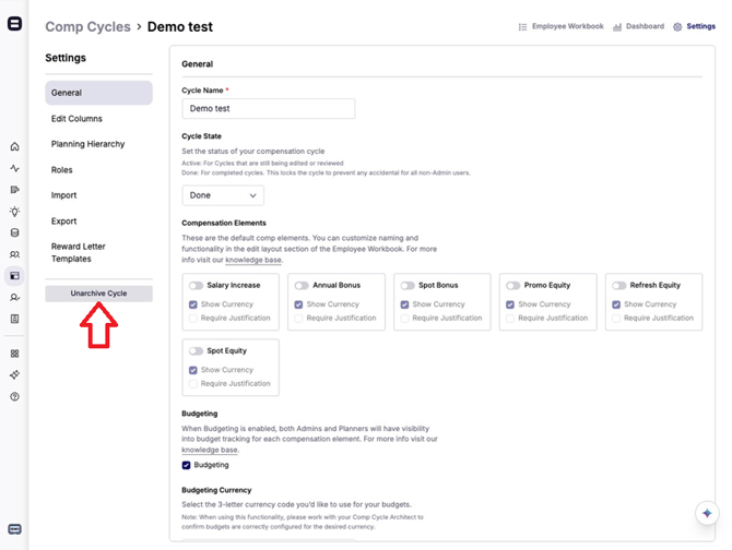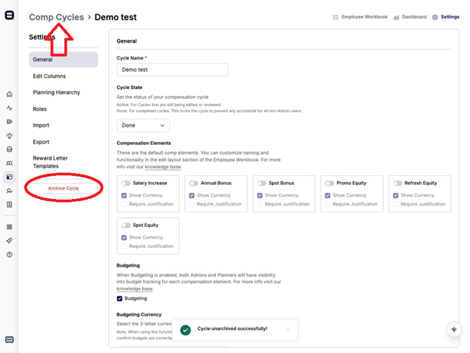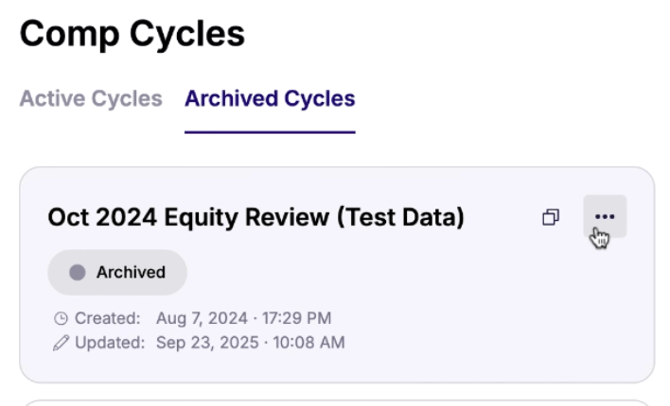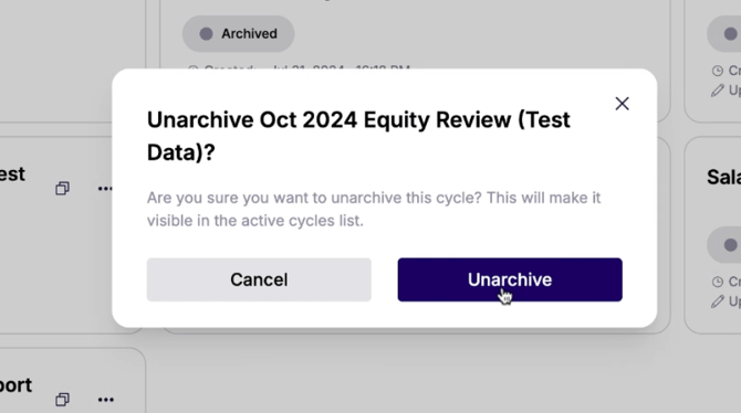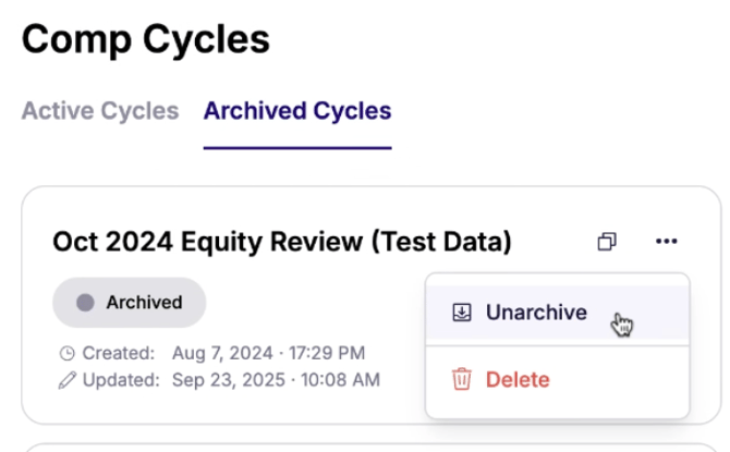 Unarchiving a cycle in Pequity allows Admin users to restore access to previously archived compensation cycles. Once unarchived, the cycle will reappear in the Compensation Cycles list and become fully accessible again.
