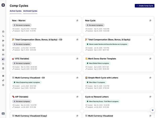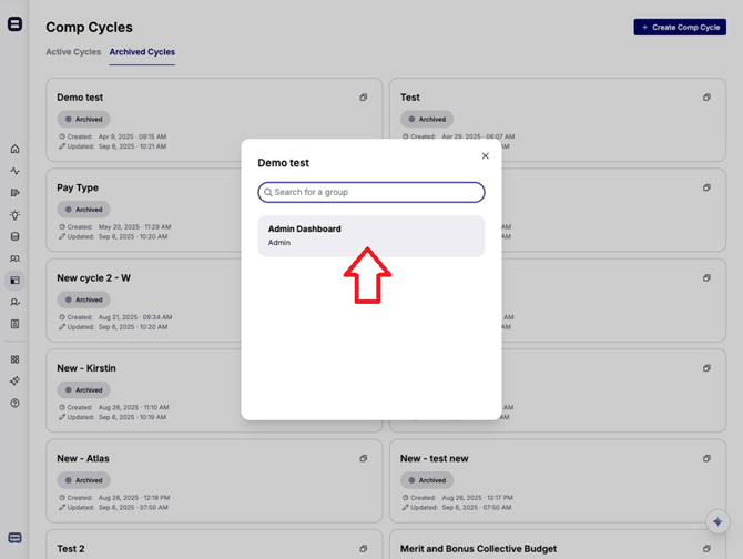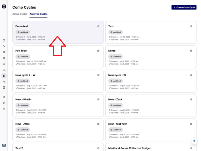 At the upper left of your screen, under the Comp Cycle title, you’ll see two tabs: Active Cycles and Archived Cycles.